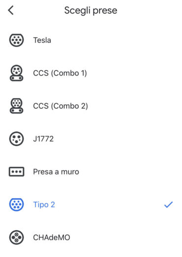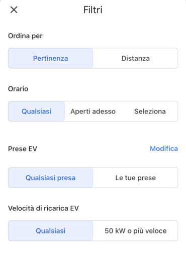Per rendere l’utilizzo più veloce ed efficiente, è possibile filtrare la ricerca sulla base dei tipi di connessione compatibili con il veicolo elettrico – J1772, CCS (Combo 1), Tipo 2, CCS (Combo 2), CHAdeMO, Tesla – o in base alla velocità di ricarica del veicolo elettrico – qualsiasi, 50 kW o più.