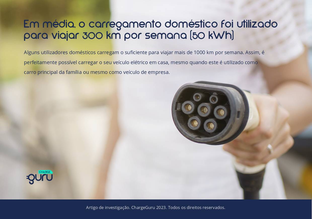 Em média, os utilizadores conseguem carregar 50 kWh por semana, o que corresponde a 300 km. Certos utilizadores carregam o suficiente para viajar mais de 1.000 km por semana. Resumidamente, é possível carregar em casa mesmo tendo uma utilização intensiva do seu veículo elétrico.