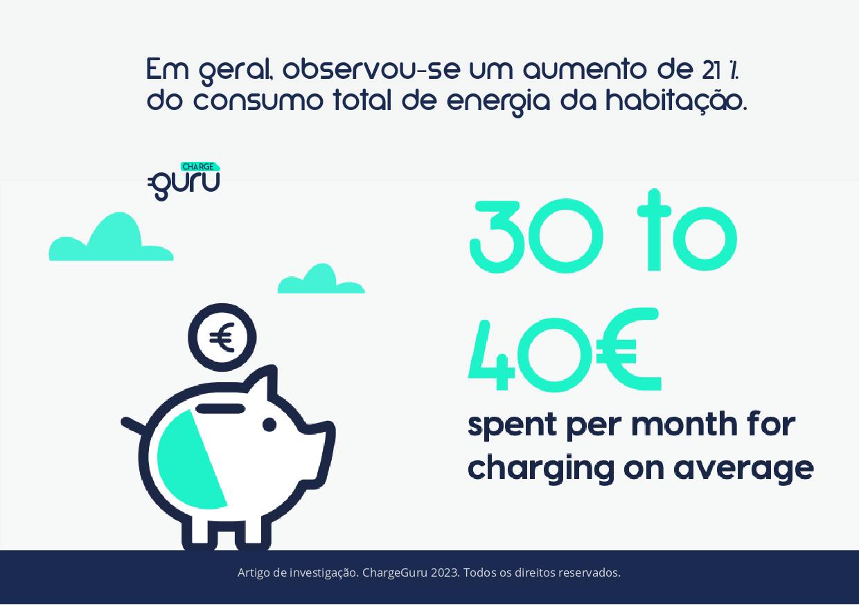 Destacamos um aumento de 21% do consumo total de energia da habitação. Como demonstrado na questão anterior, os utilizadores costumam carregar 50 kWh por semana. Este consumo representa um aumento de 30 a 40 euros por mês na sua fatura da luz. Trata-se de um custo médio que pode ser otimizado com a instalação de painéis solares ou se optar por uma tarifa bi-horaria.