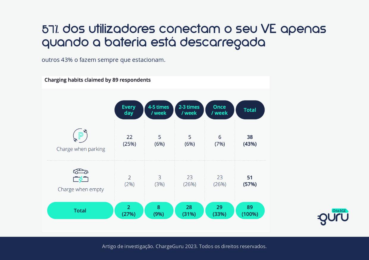 A frequência de carregamento depende das necessidades e hábitos de cada um. Verificamos que 57% dos utilizadores carregam o seu veículo apenas quando a bateria esta descarregada, e os restantes 43% sempre que estacionam.
