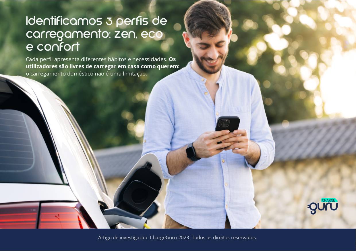 Foram identificados 3 perfis de carregamento: zen, eco e confort. Cada perfil apresenta diferentes hábitos e necessidades. Os utilizadores são livres de carregar em casa como querem: o carregamento doméstico não é uma limitação.